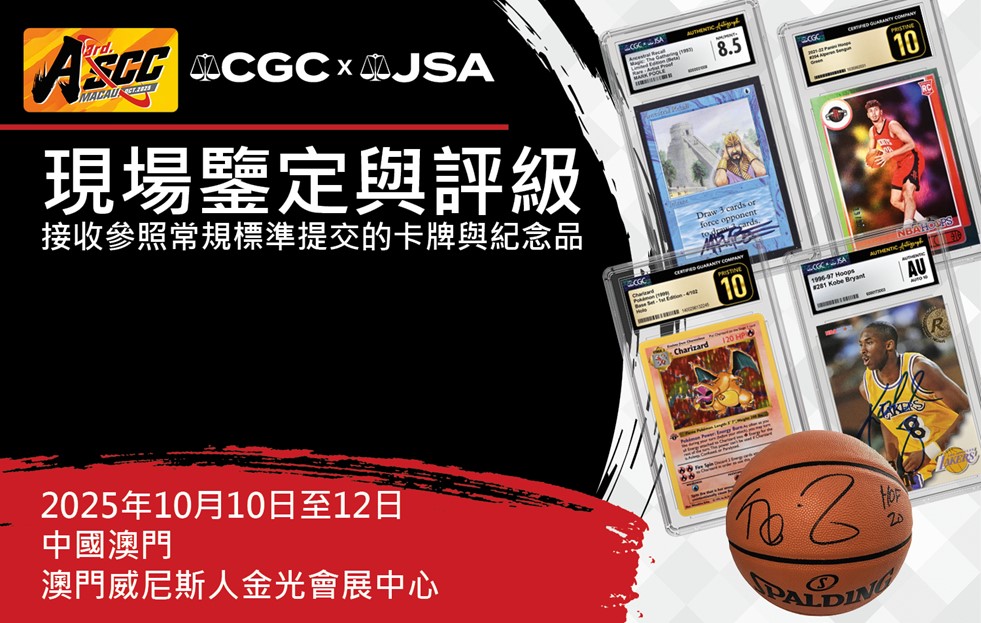 CGC與JSA很高興地宣佈將在亞洲球星卡及體育藏品展(ASCC)上為體育卡、集換卡、非體育卡和紀念品提供現場服務。本次展會將於2025年10月10日至12日在中國澳門威尼斯人酒店(The Venetian Macau)的金光會展中心(Cotai Expo Hall)舉辦。值得一提的是,CGC x JSA是2025年亞洲球星卡及體育藏品展的官方簽名鑒定服務提供商,而CGC簽名系列(CGC Signature Series)見證者亦將出席於展會現場所舉辦的親簽活動。