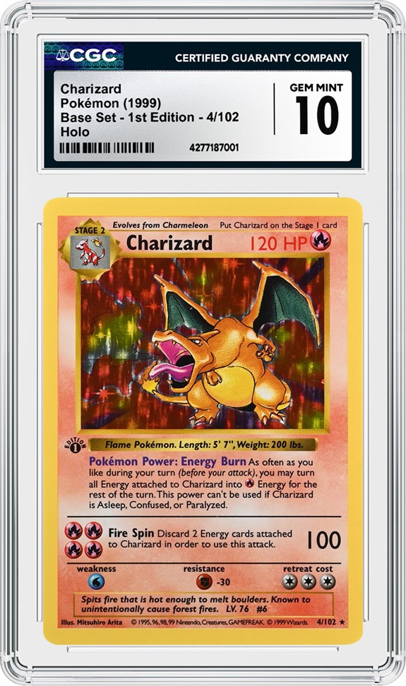 此外,同場爭豔的拍品還有一張評級等級為CGC Gem Mint 10的1999年《寶可夢》基本系列第一版噴火龍(Charizard)全息閃膜卡(拍品號36069)。目前收錄於CGC Cards數量報告之中的同類別卡牌共有599張,其中僅有33張的評級等級為CGC Gem Mint 10,而獲得更高評級等級的卡牌僅有2張*(截至2026年3月12日的數據)。噴火龍堪稱史上人氣最高的寶可夢,其基本系列卡牌更是全球藏家競相追逐的珍品。