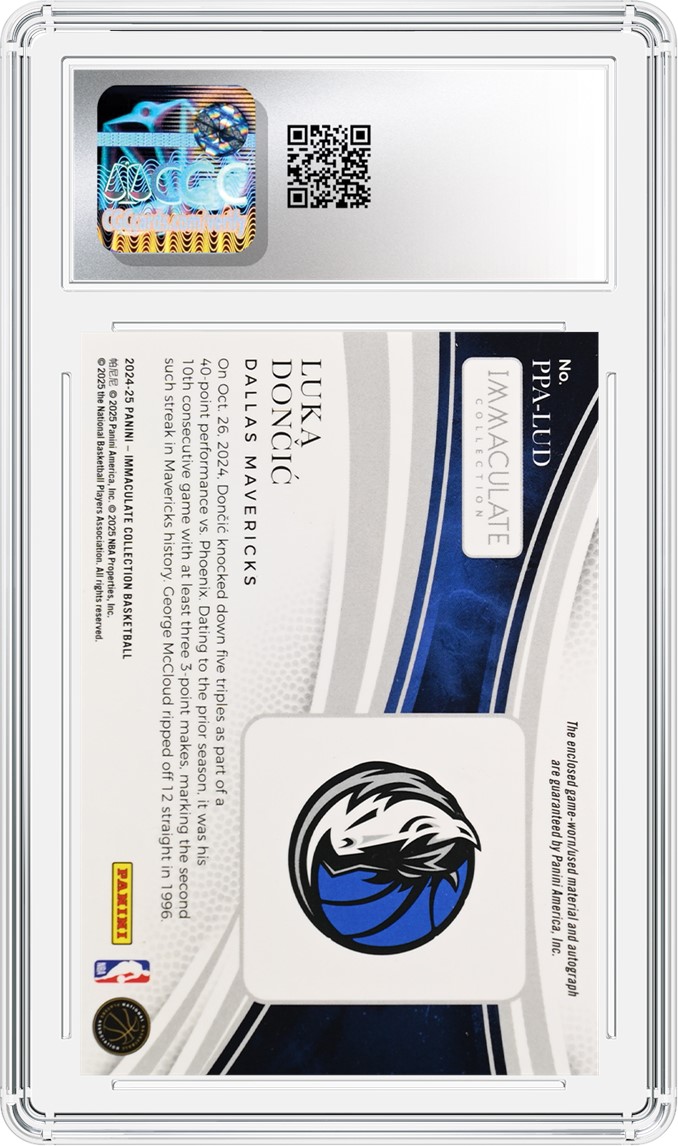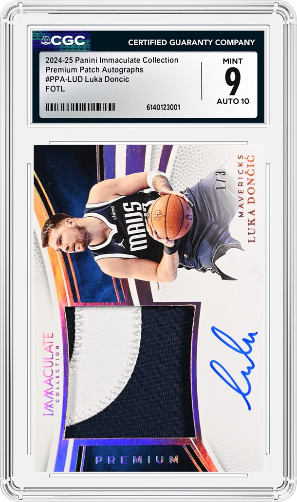 本年度發行的當錫球衣實物簽名卡內嵌的仍是其效力多年的達拉斯獨行俠隊(Dallas Mavericks)球衣。若想在Immaculate Collection系列看到身著湖人紫金戰袍的當錫卡牌,還需等待後續推出的相關系列。上圖即為一張2024-25賽季Panini Immaculate Collection Premium Patch Autographs系列#PPA-LUD盧卡·當錫球衣實物簽名卡(先行版)。這張卡牌獲評CGC 9,簽名評分達CGC 10。這款當錫球衣實物簽名卡僅發行3張,也是記錄當錫七年獨行俠生涯的最後幾款重磅高端卡牌之一。