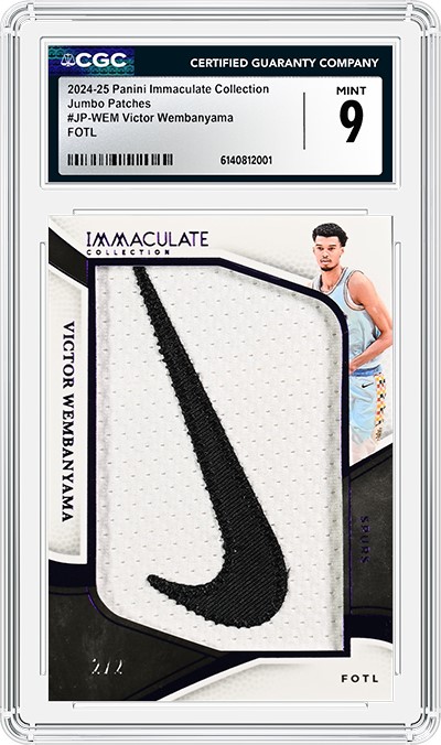 全新推出的Immaculate Collection系列依舊沿襲其一貫的稀缺屬性,採用單個Hobby盒僅含一包,每包僅含六張卡牌的規格。每盒固定含六張高端卡牌,一張為普卡、平行卡或特卡,兩張為球衣實物卡,還有三張為簽名卡。要說這款年度旗艦系列頗受藏家青睞的亮點,當屬其中稀有的球員比賽球衣實物卡。這類卡牌會在卡面內嵌球衣關鍵元素切片,諸如姓名字樣、球衣號碼、球隊徽標等,部分特殊實物卡還會直接嵌入完整的球衣品牌標識。上圖這張評級等級為CGC 9的2024-25賽季Panini Immaculate Collection Jumbo Patches系列#JP-WEM雲班耶馬(先行版)便鑲嵌了完整的耐克品牌標識切片。