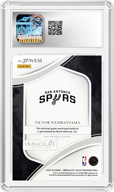 此款珍罕卡牌僅發行2張,其中內嵌的實物物料取自雲班耶馬(Victor Wembanyama)比賽時身穿的球衣。雲班耶馬可謂當下NBA收藏圈炙手可熱的新星,故與之相關的這張球衣實物卡也是Immaculate Collection系列中藏家競相追捧的卡牌。